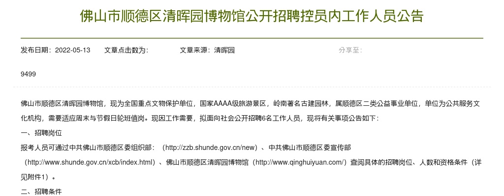原标题:山市顺德区清晖园博物馆公开招聘控员内工作人员公告