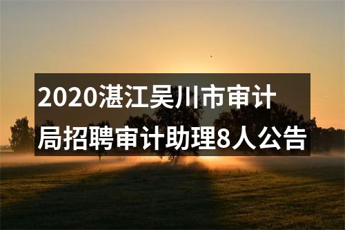 招聘公告汇总 备考辅导课程 备考活动汇总2020广东湛江吴川市审计局招聘审计助理8人公告已发布,报名时间:2月26日-3月11日。更多广东公益性岗位招聘信息,关注佛山公益岗招考信息页面。