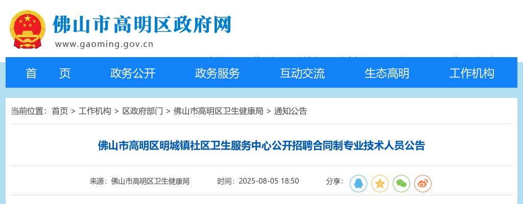 原标题:佛山市高明区明城镇社区卫生服务中心公开招聘合同制专业技术人员公告